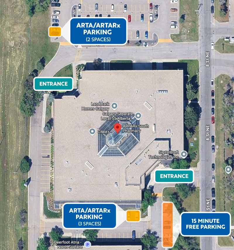 ARTA stalls are located on the north side of the building, facing 8 Street NE. ARTARx stalls are located on the south side of the building, near the Deerfoot Atria entrance.